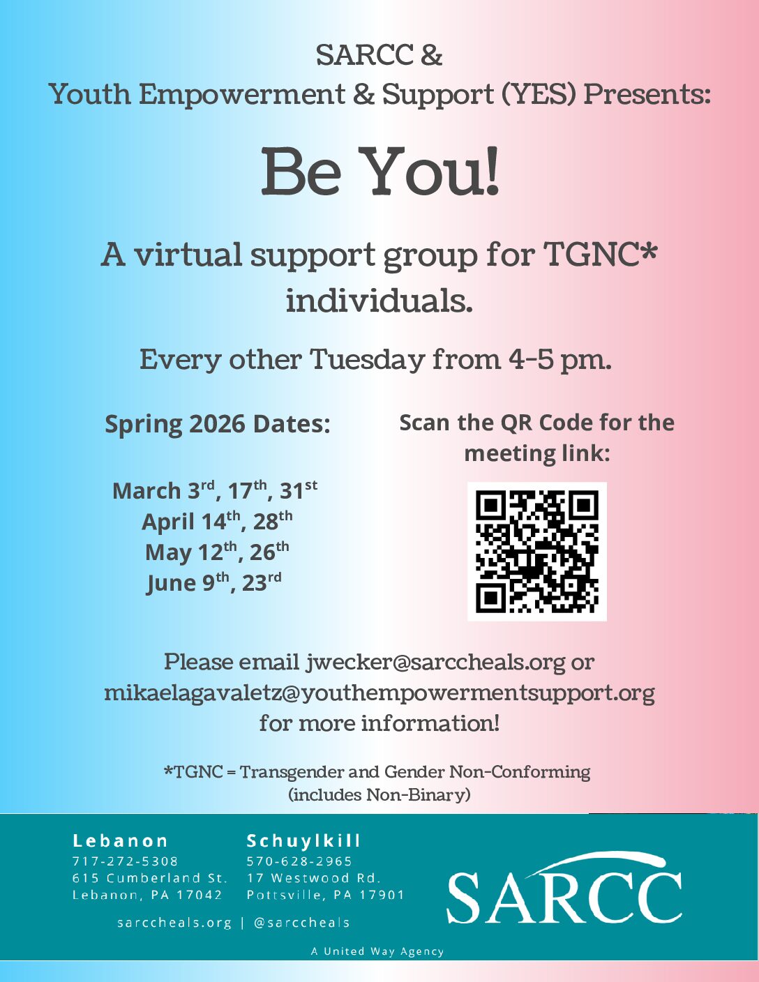 SARCC & Youth Empowerment & Support (YES) Presents: Be You! A virtual support group for TGNC* individuals. *TGNC = Transgender and Gender Non-Conforming (includes Non-Binary) Spring 2026 Dates: March 3rd, 17th, 31st April 14th , 28th May 12th , 26th June 9th , 23rd Every other Tuesday from 4-5 pm. Scan the QR Code for […]